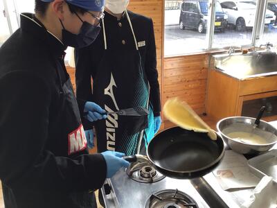 20日(月)、国際理解教育の学習として、台湾、フランスの文化や食を体験する授業が実施されました。生徒たちは台湾かフランスいずれかの自分が希望した国について、国際交流員の羅房さん、メリサさんから指導を受け、各国の体験をしました。台湾は台湾ゴマ遊び、フランスはペタンクで体を動かし、調理体験ではそれぞれの国のクレープ作りをしました。どちらのグループも楽しく体験をしていました。