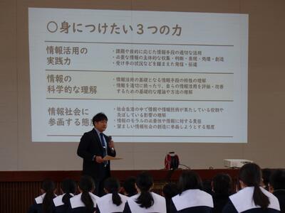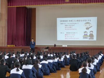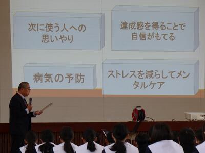 学校オリエンテーションで、生活、学習、美化、情報について話を聞きました。