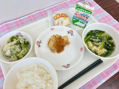 ご飯、鶏肉の梨ソースがけ、ブロッコリーサラダ、かきたま汁、お米のタルト、牛乳