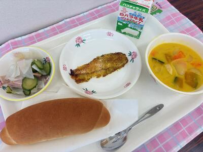 コッペパン、はまちのカレーパン粉焼き、野菜のマリネ、かぼちゃのポタージュ、牛乳