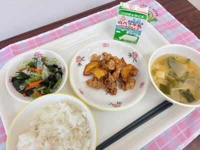 ご飯、鶏肉とさつまいもの揚げ煮、かおり和え、豆腐のみそ汁、牛乳