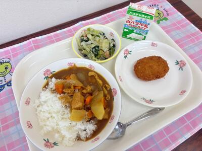 ご飯、野菜コロッケ、ツナサラダ、チキンカレー、牛乳