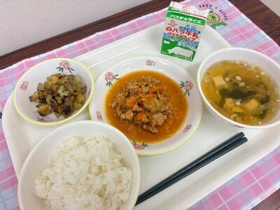 ご飯、砂丘らっきょうのそぼろ炒め、大学いも、わかめのすまし汁、牛乳