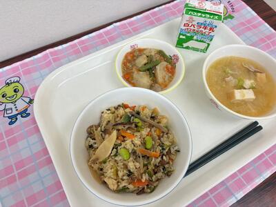 今月の郷土料理献立は「オリジナル竹田おこわ」です。「オリジナル竹田おこわ」は、三朝南小学校の児童が、かつて地域の「竹田おこわ」を参考に考えた料理です。どんな具材を入れたらいいのか、地域の人にアンケートした結果、竹田の自然をイメージした緑色のほうれん草や枝豆を入れることになりました。さらに試行錯誤し、今の「オリジナル竹田おこわ」となりました。ほかにどんな具材が入っているでしょう。探しながら食べてみてくださいね。