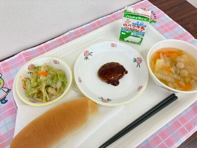 コッペパン、ごぼう入りハンバーグ、枝豆サラダ、白菜とウインナーのスープ、牛乳