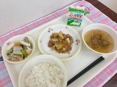 ご飯、さといものそぼろ炒め、いかの中華サラダ、くきわかめスープ、牛乳
