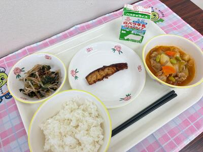 ご飯、鮭の照り焼き、青菜のポン酢和え、ピリ辛肉じゃが、牛乳