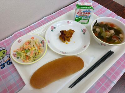 コッペパン、タンドリーチキン、マカロニサラダ、トマトスープ、牛乳
