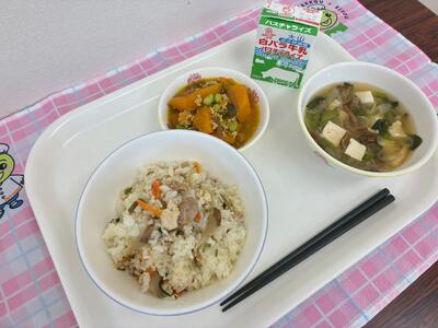どんどろけめし、かぼちゃのそぼろ煮、なめこ汁、牛乳
