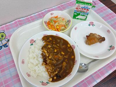 ご飯、ガーリックチキン、コールスローサラダ、三朝神倉大豆入りハヤシライス、牛乳