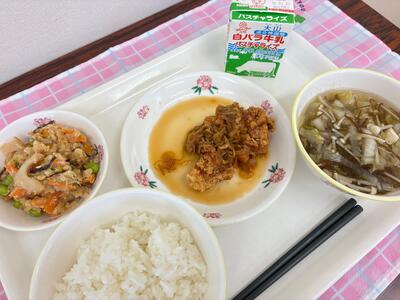 そして今月は「鶏肉のからあげ ~白ねぎソースがけ~」を統一メニューとして町内の保育園 、こども園 、三朝小中学校で食べています。今日食べた給食について、お家で話してみましょう。