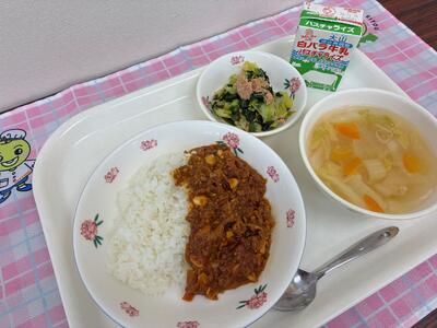 ご飯、三朝神倉大豆のドライカレー、ほうれん草サラダ、三朝野菜のスープ、牛乳