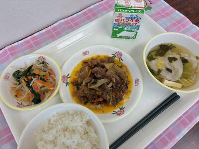今日の主菜は「プルコギ」です。プルコギは、韓国の代表的な料理で、「プル」は火、「コギ」は肉という意味があります。その名前の通り、味つけしたお肉を火で焼いたり炒めたりして作る料理です。今日のプルコギには、牛肉とにんじん、白菜、にらなどの野菜が使われています。牛肉には、体をつくるもとになる「たんぱく質」が多く含まれていて、成長期のみなさんに大切な栄養です。甘辛い味つけなので、ごはんともよく合いますね。いろいろな料理を味わって、昼からの授業も元気にがんばりましょう!