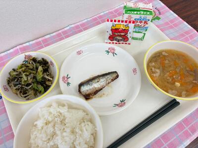 ご飯、いわしの梅煮、のり酢和え、スキー汁、節分豆、牛乳