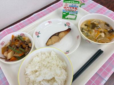 ご飯、はまちの塩こうじ焼き、炒り鶏、白菜のみそ汁、牛乳