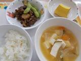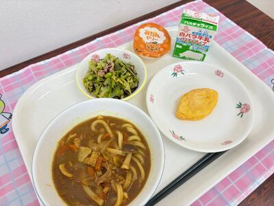 カレーうどん、オムレツ、ひじきサラダ、みかんゼリー、牛乳