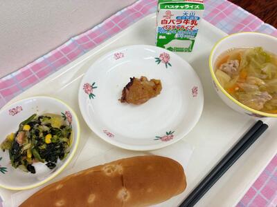 アップルパン、はちみつチキン、ほうれん草と白菜のサラダ、キャベツのスープ、牛乳