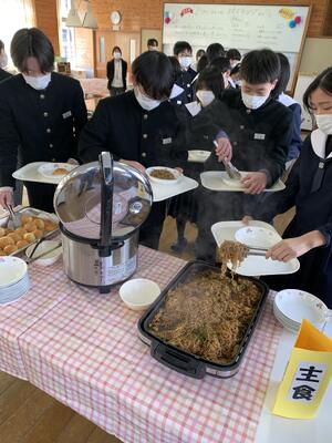 2月19日(1組)、26日(2・B組)に卒業する3年生に向けた卒業お祝いバイキング給食を実施しました。
