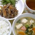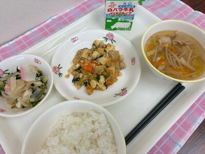 ご飯、ジャージャン豆腐、イカの中華サラダ、豚もやしスープ、牛乳