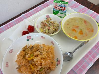 チキンライス、ごぼうサラダ、長いもポタージュ、いちご、牛乳