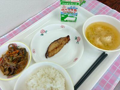 ご飯、さけの照り焼き、五目きんぴら、手作り鶏だんごのみそ汁、牛乳