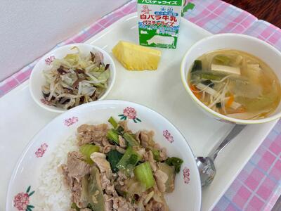 今日は今が一番おいしい季節の果物、台湾パインを給食に出しました。台湾パインは通常のパインより酸味が少なく、甘味が強いのが特徴です。また、芯まで食べられます。台湾パインの甘味や香りを感じながらおいしく食べてください。