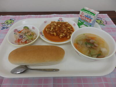 ご飯、ジャージャン豆腐、黒糖大学いも、中華スープ、牛乳