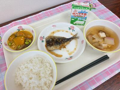 ご飯、いわしのらっきょう南蛮、かぼちゃのそぼろ煮、神倉豆腐のすまし汁、牛乳